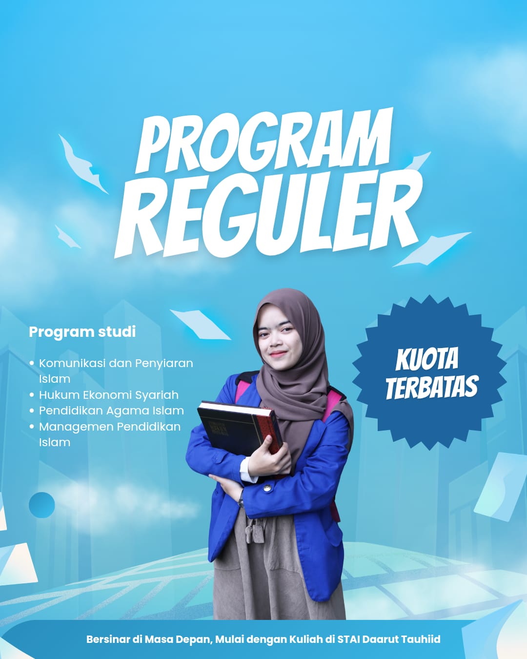 STAI Daarut Tauhiid membuka kesempatan bagi generasi muda untuk bergabung dalam Program Reguler, sebuah program pendidikan tinggi berbasis nilai-nilai tauhid, integritas, dan kemandirian. Melalui program ini, mahasiswa tidak hanya dibekali ilmu akademik, tetapi juga karakter kuat dan kemampuan praktis yang relevan dengan kebutuhan dunia kerja.