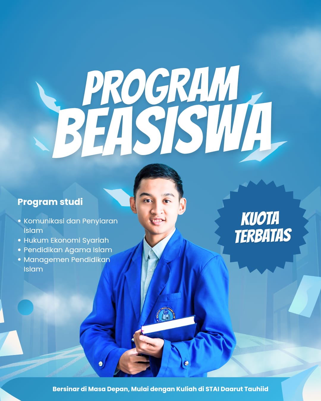 STAI Daarut Tauhiid membuka kesempatan bagi generasi muda yang ingin menempuh pendidikan tinggi berbasis nilai-nilai tauhid, integritas, dan kemandirian. Melalui program beasiswa unggulan, kampus ini berkomitmen mencetak insan akademis yang berilmu, berakhlak, dan bermanfaat bagi masyarakat.